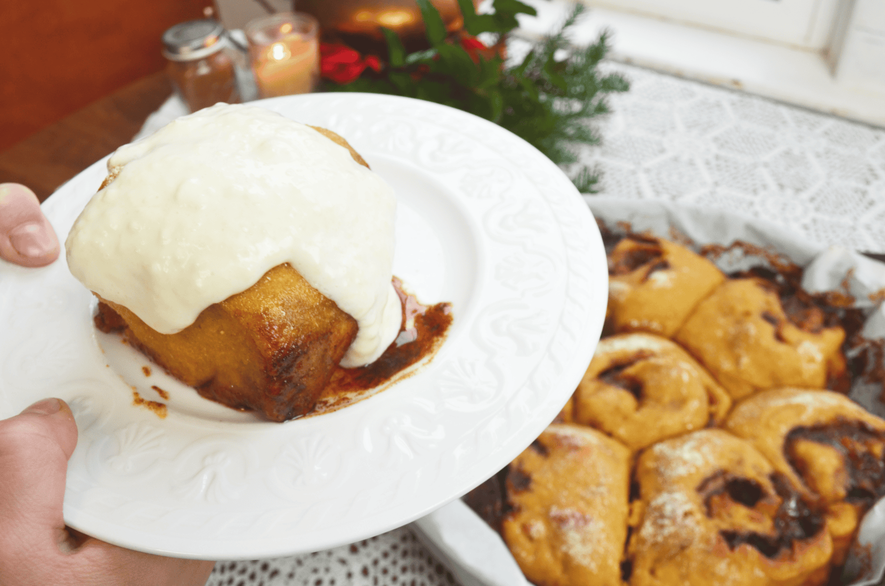 You can enjoy your cinnamon roll straight from the oven, slightly warmed up, or at room temperature. Did you know that cinnamon rolls can be froze and reheated later? (This is great if you make a batch but don’t want to eat that many, or want to freeze some to have on hand for healthy breakfasts). HERE’S how I recommend freezing your cinnamon rolls for a long tasty life.